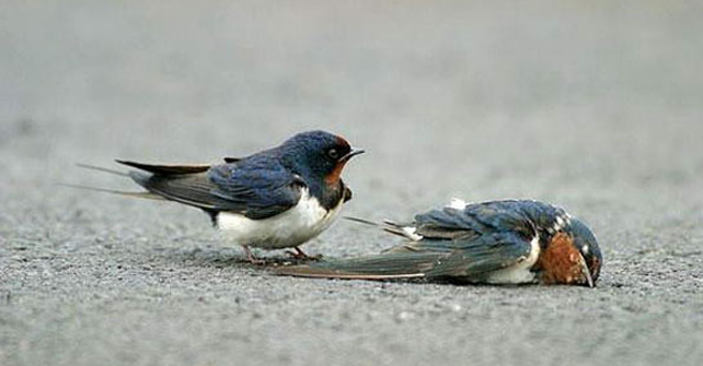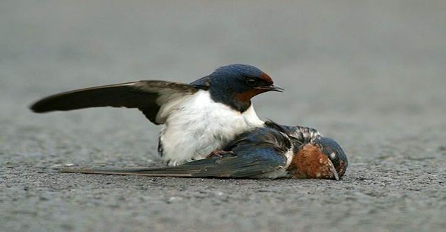 She was hit by a car as she swooped low across the road. Here her mate brought her food and attended to her with love and compassion. He brought her food again, but was shocked to find her dead. He tried to move her ... A rarely-seen effort for swallows!